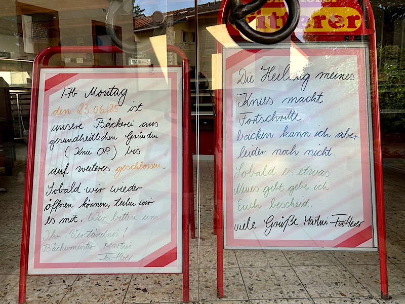4. Schnell bei meinem Lieblingsbäcker vorbei, der als einziger im weiten Umkreis noch handwerlich selber bäckt und nicht nur industrielle Teiglinge aufbackt. Leider hat er nach einer Knieoperation noch immer geschlossen. Was ich klasse finde, ist, wie er kommuniziert. Ende Juni stand nur das linke Schild da. Und jetzt gibt es noch das zweite Schild, rechts im Bild. Darauf gibt er seinen Kunden eine Zwischeninfo, statt einfach nur zuzuwarten und uns im Ungewissen zu lassen. Auch das gehört zu integrem Verhalten: Kommuniziere verbindlich und klar, idealerweise mit messbaren Zielen und Terminen. Wenn sich dann abzeichnet, dass ein Termin nicht gehalten oder ein Ziel nicht wie vereinbart eingehalten werden kann, dann gibt es eine proaktive Zwischeninfo. Dann wissen alle Bescheid und es gibt keine Irritationen oder Missstimmungen, weil niemand weiß, was Sache ist.