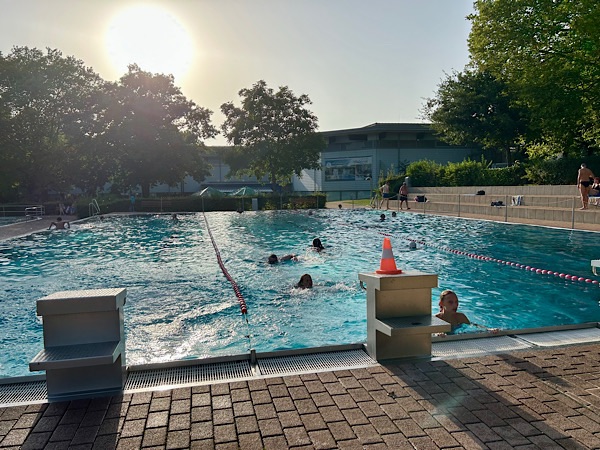 8. Es ist schon 18:45 Uhr und ich möchte noch schnell ein paar Bahnen schwimmen, um mich abzukühlen und zu bewegen. Insbesondere meiner Frozen Shoulder tut die Schwimmbewegung gut! Da meine Frau das Auto hat, schwinge ich mich auf’s Rad und fahre ins Schwimmbad.